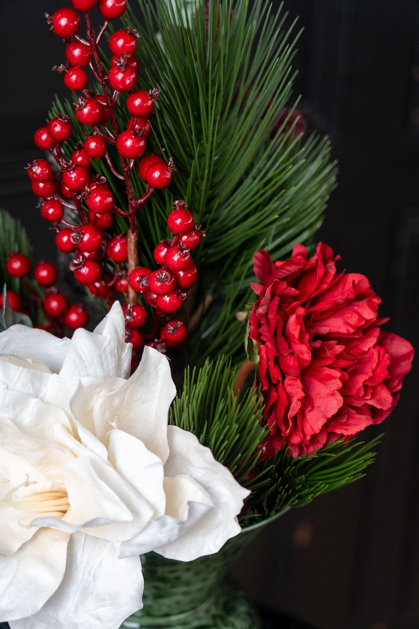 Boeket Belle is het elegante zusje van Ruby: een klassiek en tijdloos kerstboeket. Met rijke dennetakken, een stralende witte amaryllis en speelse rode besjes brengt dit boeket direct warmte en sfeer in huis.