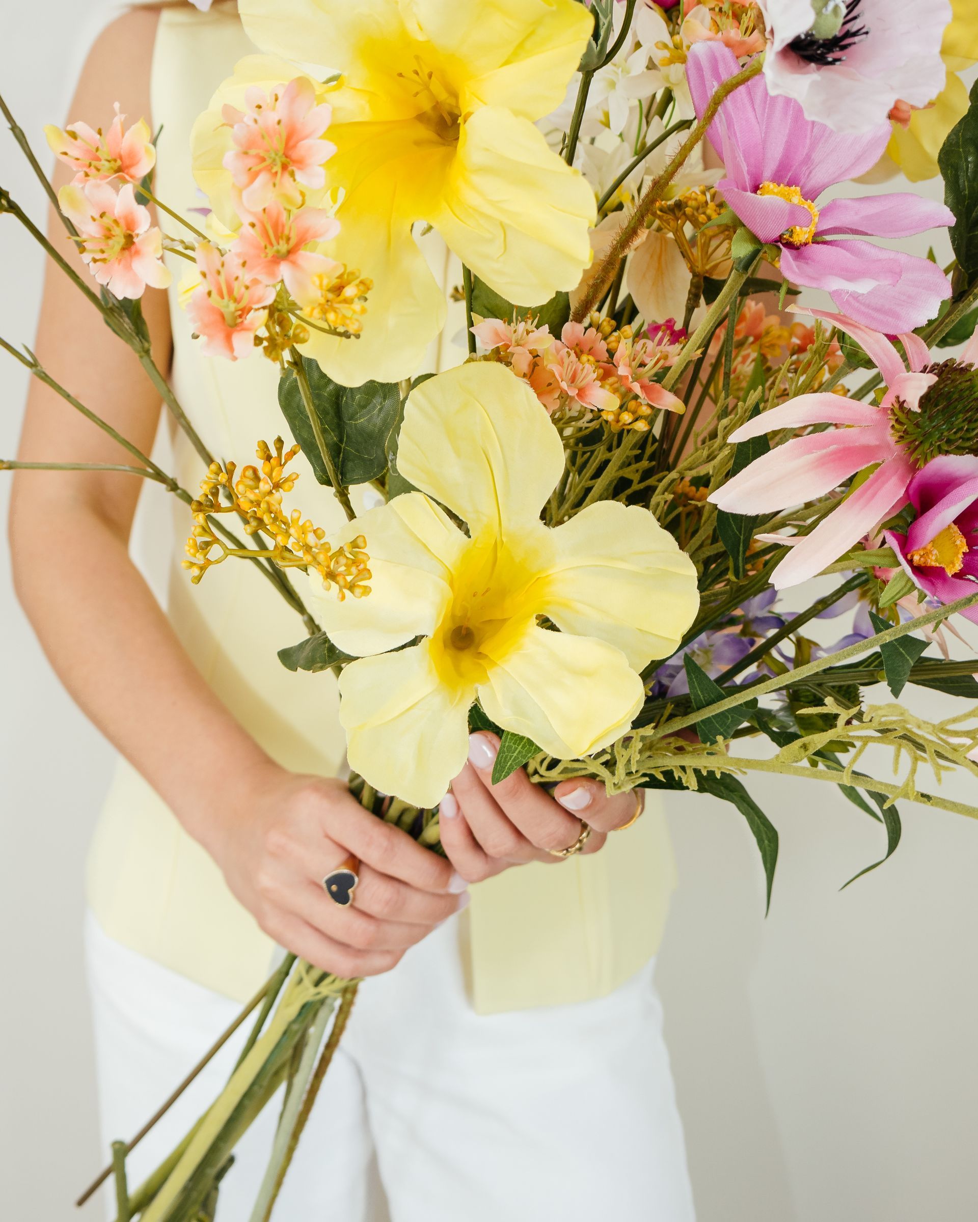 Haal de zon in huis met Boeket Maeve — een zijden boeket dat direct een glimlach op je gezicht tovert. Dit luchtige en kleurrijke boeket bestaat uit een speelse mix van bloemen in zachte pastel- en zomerse tinten zoals zonnig geel, lief lila, fris wit en poederroze. De combinatie van verschillende bloemvormen en natuurlijke accenten zorgt voor een nonchalante, frisse uitstraling.