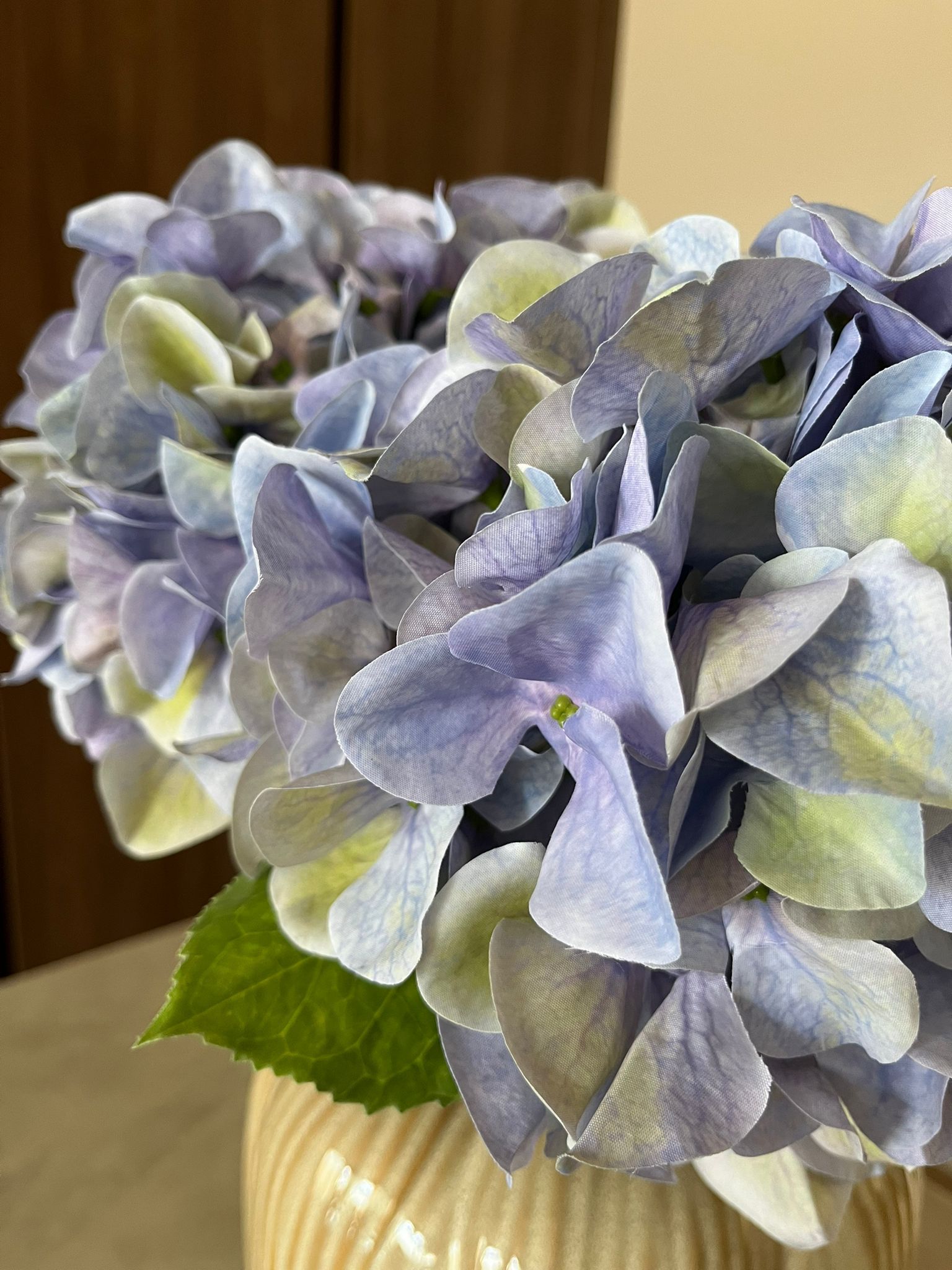 Breng sfeer en elegantie in je interieur met deze prachtige blauwe kunst hortensia van 50 cm. Deze hoogwaardige zijden hortensia is tot in detail nagemaakt en heeft een volle, natuurlijke uitstraling met subtiele kleurnuances van zachtblauw, lila en groen. Perfect voor wie houdt van bloemen in huis zonder onderhoud.